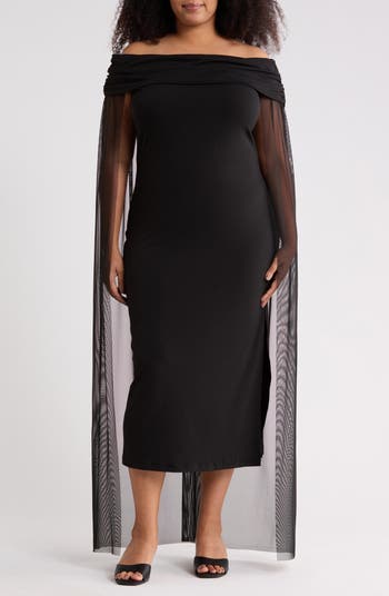 A sheer cape falls gracefully from the shoulder-baring silhouette of a cocktail dress that has you looking elegant from first toast to last dance.