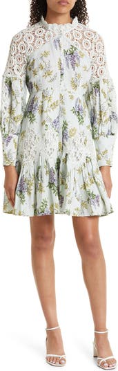 Lovely lace accents this lightweight linen-blend dress covered in enchanting blooms with puff sleeves and a flared skirt.