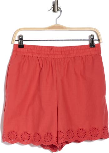 Scalloped hems with embroidered eyelet detailing sweeten the vibe of these cotton pull-on shorts made from soft, breathable cotton.