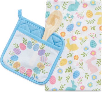 Perfect for Easter gifting or updating your decor, this three-piece set features a cotton tea towel, potholder and wooden spoon that bring a perfect balance of contemporary charm and everyday function to any kitchen.