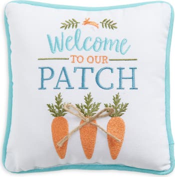 Add a pop of springtime charm to your Easter decor with this bunny-and-carrot-embroidered accent pillow made from pure cotton.