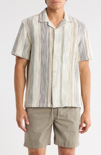 A relaxed silhouette sets an easygoing tone in this sun-ready camp shirt cut from cotton-rich fabric with a textured, stripe-patterned weave.