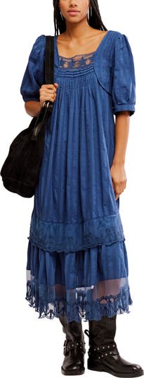 Replete with boho charm, this vintage-inspired midi dress abounds in texture with pintucks, piping and embellished lace. A open back detailed with adjustable ties enhances the laid-back vibe.