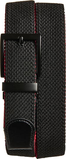 A solid, stretch weave ensures a comfortable fit in this reversible belt styled with a square buckle and faux leather keeper.