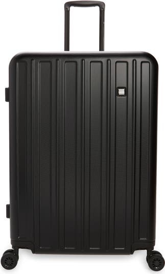 A hard-shell exterior provides durable, easy-to-carry utility in this water-resistant suitcase fitted with a set of four multidirectional spinner wheels for effortless airport navigation.