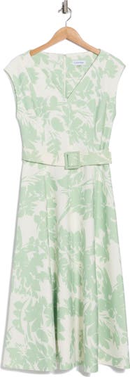 Show off perfectly polished style in this cap-sleeve midi dress fashioned in a belted A-line silhouette.