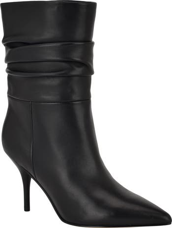 A slouchy shaft brings contemporary intrigue to a luxe bootie framed by a pointy toe and tapered heel.