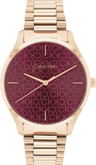 Minimalist stick indexes let the monogram sunray dial shine in this modern watch featuring an integrated bracelet strap.