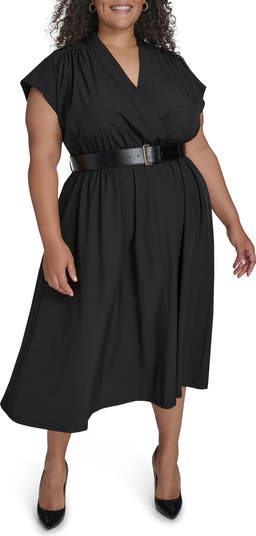 Easily transition from desk to dinner in this cap-sleeved shirtdress that's cut to a midi length and styled with abbreviated sleeves.