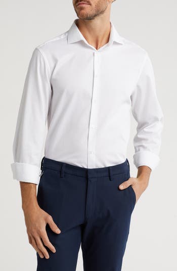 Pearlized buttons punctuate a modern slim-fit dress shirt made with a touch of stretch for added comfort.