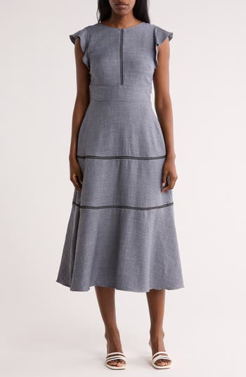 Fluttery cap sleeves frame a fit-and-flare midi dress featuring whimsical ladder-stitched trim and a gracefully tiered skirt.