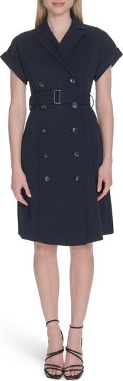 From desk days to drinks dates, this chic sheath dress features a double-breasted button front and a waist-defining belt that keeps pace with your schedule.