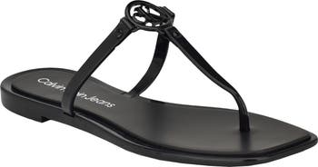 A cutout logo medallion elevates this sleek flip-flop topped with slender straps and balanced on a flat sole.