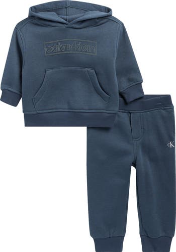 The brand's logo puts their signature spin on a hoodie and joggers set made from cotton-blend fleece that delivers a perfect amount of warmth to baby.
