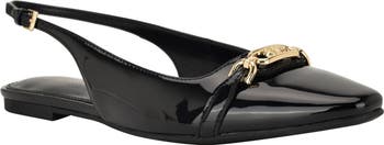 Gleaming logo hardware shines atop the vamp of this slingback flat featuring a glossy patent finish.
