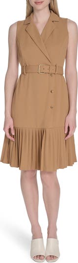 An adjustable waist belt and notched collar frame a polished shirtdress complete with a sharp pleated flounce-hem skirt for refined desk-to-dinner style.