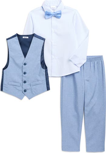 Your little darling will look dapper on special occasions when they don this set that pairs a stripe vest with a dress shirt, pants and a bow tie.
