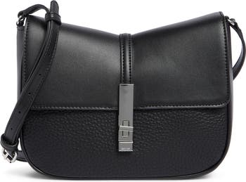 An ultrasmooth flap contrasts the dramatically grained body of this faux-leather crossbody featuring a softly concave topline and logo-engraved hardware.