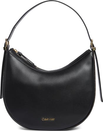High-polish logo hardware glints at the front of this slouchy faux-leather handbag designed with a softly curved topline.