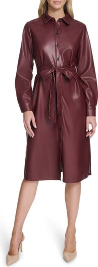 Feel your finest in this faux-leather, long-sleeve shirtdress cinched with a tied belt and cut to a knee length.