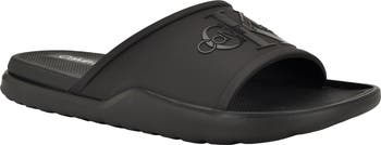 Bold logo debossing adds a signature flourish to the wide strap on a minimalist slide sandal grounded by a treaded sole.