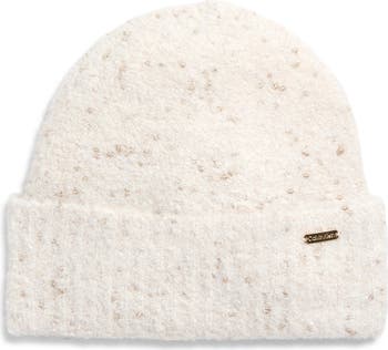 Chilly days call for this cuffed beanie made from cozy knit with metallic accents.