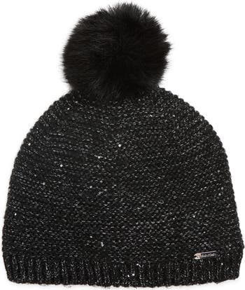 Sequins and metallic threads add a freshly fallen snow sparkle effect to a soft knit beanie finished with plush, faux-fur pom.