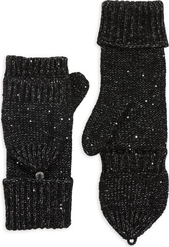 Sequins and metallic threads add a freshly fallen snow shimmer to soft knit gloves finished with flip tops to grip and grab without slipping.