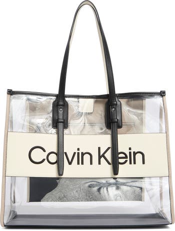Signature logo lettering decorates a see-through tote bag with ample space for carrying your essentials and belongings.