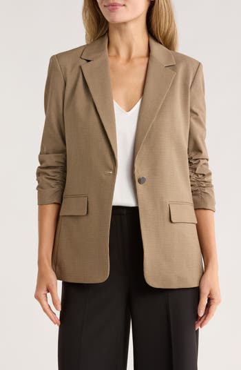 Ruched sleeves and notched lapels frame this work-to-weekend blazer cut from stretch-enhanced check fabric.