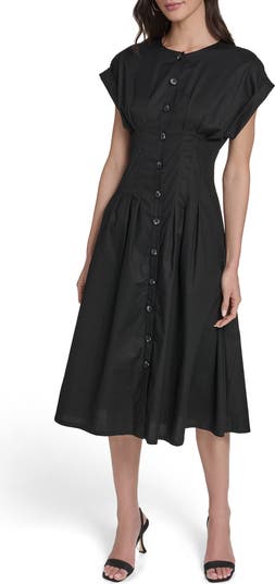 Perfect for any occasion, this polished shirtdress is finished with short dolman sleeves and pin-tuck pleats that comfortably shape the fit-and-flare silhouette.