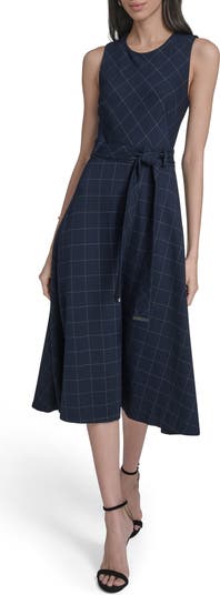 A polished plaid pattern adorns this A-line midi dress crafted from soft ponte fabric.