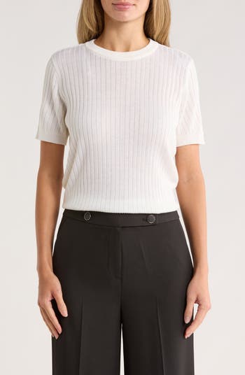 An ultralightweight ribbed sweater is knit to a short-sleeve silhouette, making it easy to layer into your look.