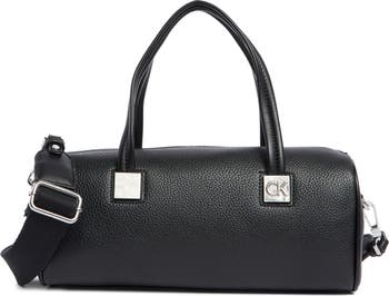A polished metal logo tag punctuates the left handle of this barrel-shaped satchel made from pebbled faux leather and finished with an optional shoulder strap.