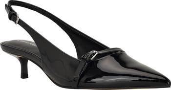 Sleek and sophisticated, this faux-patent kitten-heel pump features a glossy finish and an adjustable buckle slingback strap for a secure fit.