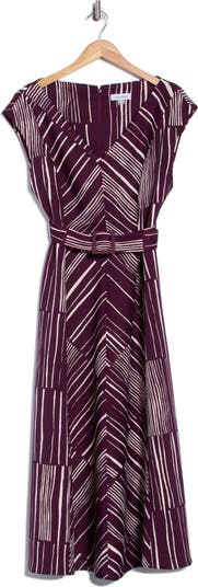 A coordinating belt with a tonal buckle cinches the silhouette of this sweeping A-line midi featuring a striking pattern of artfully variegated stripes.