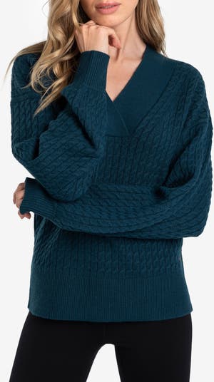 Layer on this soft, woolly cable-knit sweater framed by slouchy balloon sleeves for ultracozy style.