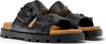 Double straps with tonal buckles create modern dimension on a leather slide sandal grounded by a cushioned footbed and durable lug sole.