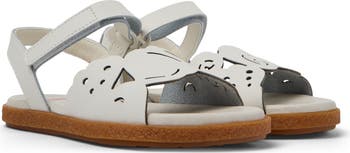 The label's signature complimentary but not identical design is scaled-down for kiddos on this flexible leather sandal featuring mismatched laser-cut details.