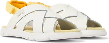 A padded slingback strap and a flexible sole bring kid-approved comfort to a sporty sandal topped with woven crisscross straps.