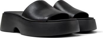 A wide leather strap and an extralightweight sole ensure flexibility and comfort in a walkable platform sandal done in a monochrome palette.