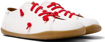 The label’s signature complementary-but-not-identical design characterize this leather slip-on sneaker with a chaotic laces pattern, giving refined definition to its low‑profile silhouette.