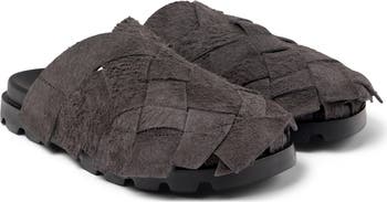 A wildly woven vamp creates funky, modern dimension on a leather slide sandal grounded by a cushioned footbed and durable lug sole.