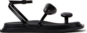 A svelte ankle strap perfects the fit of this contemporary leather sandal topped with floating bumper straps and set on a cushioned footbed.