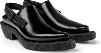 A crepey, pronounced sole grounds this pointy-to mule with clear Western inspiration and a buckle slingback for an adjustable fit.