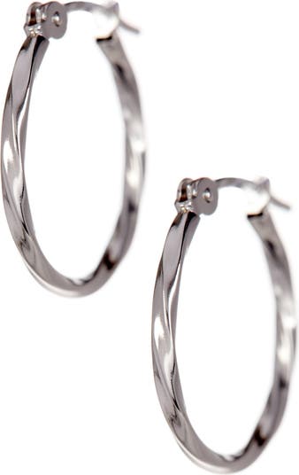 - 14K white gold twisted hoop earrings - Snap down post back - Approx. 9mm length - Made in USA Orders cannot be shipped to Canada, Puerto Rico, APO, FPO or P.O. Boxes.