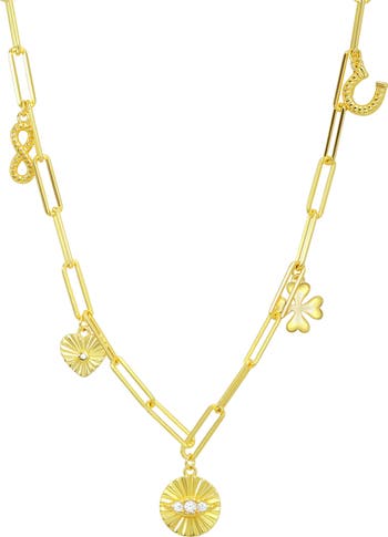 A horseshoe, a four-leaf clover, an evil eye and a gleaming heart round up the charms on this necklace made from warm goldtone plate.