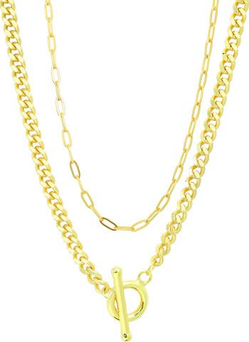 Offering an easy, stylish layered look, this goldtone plated necklace features two chain strands with paper clip and Cuban links.