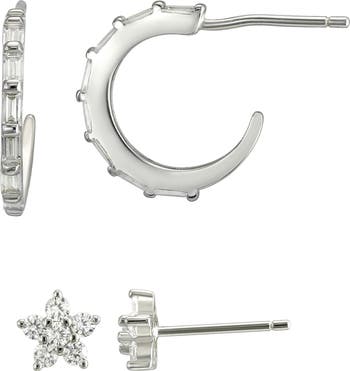 Brilliant cubic zirconia stones deliver a bright sparkle to a stunning set of earrings, including huggie hoops and studs, to stack along your lobes.