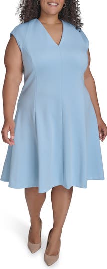 Exude charming style in this cap-sleeve fit-and-flare dress constructed from a stretchy scuba knit for maximum comfort.